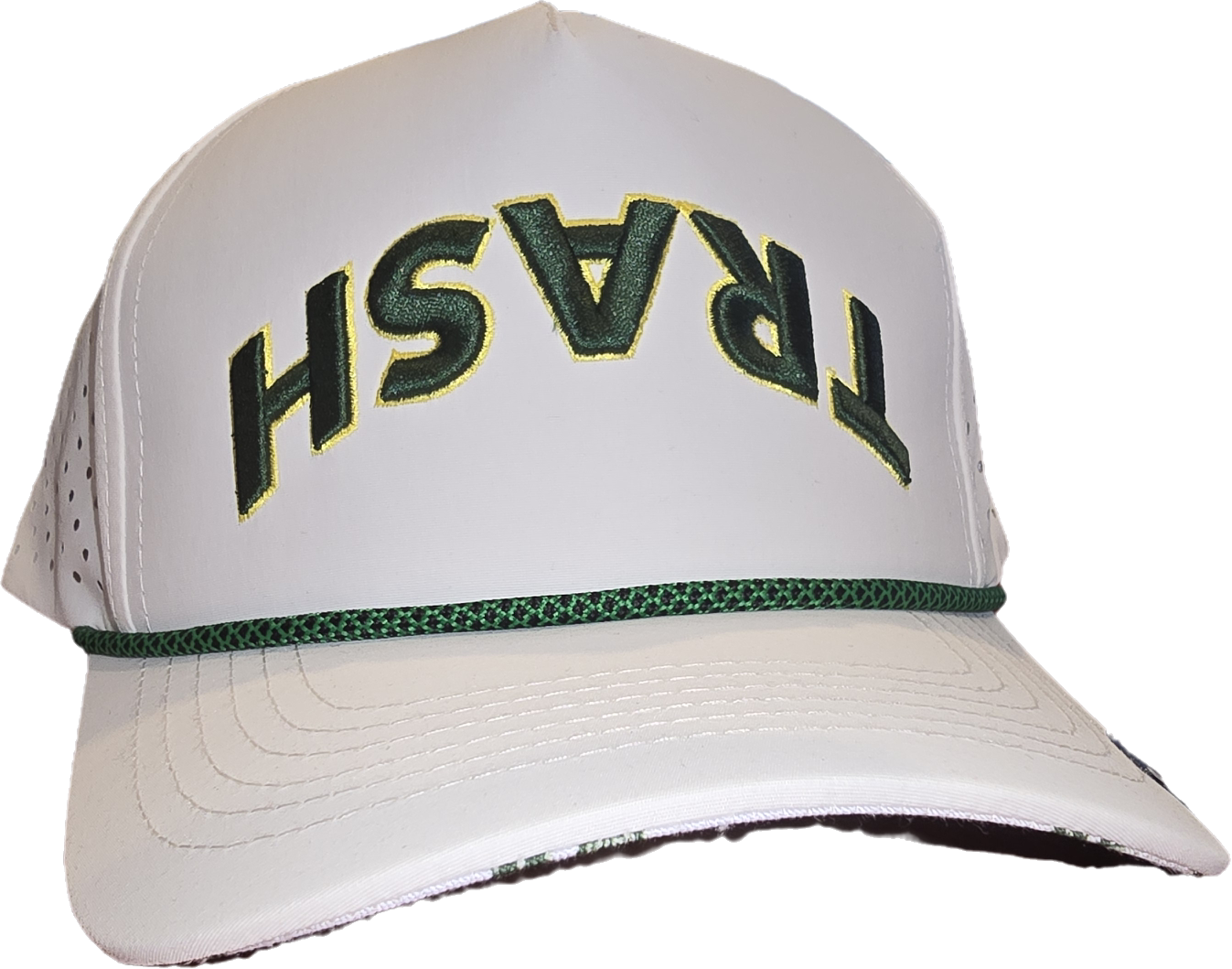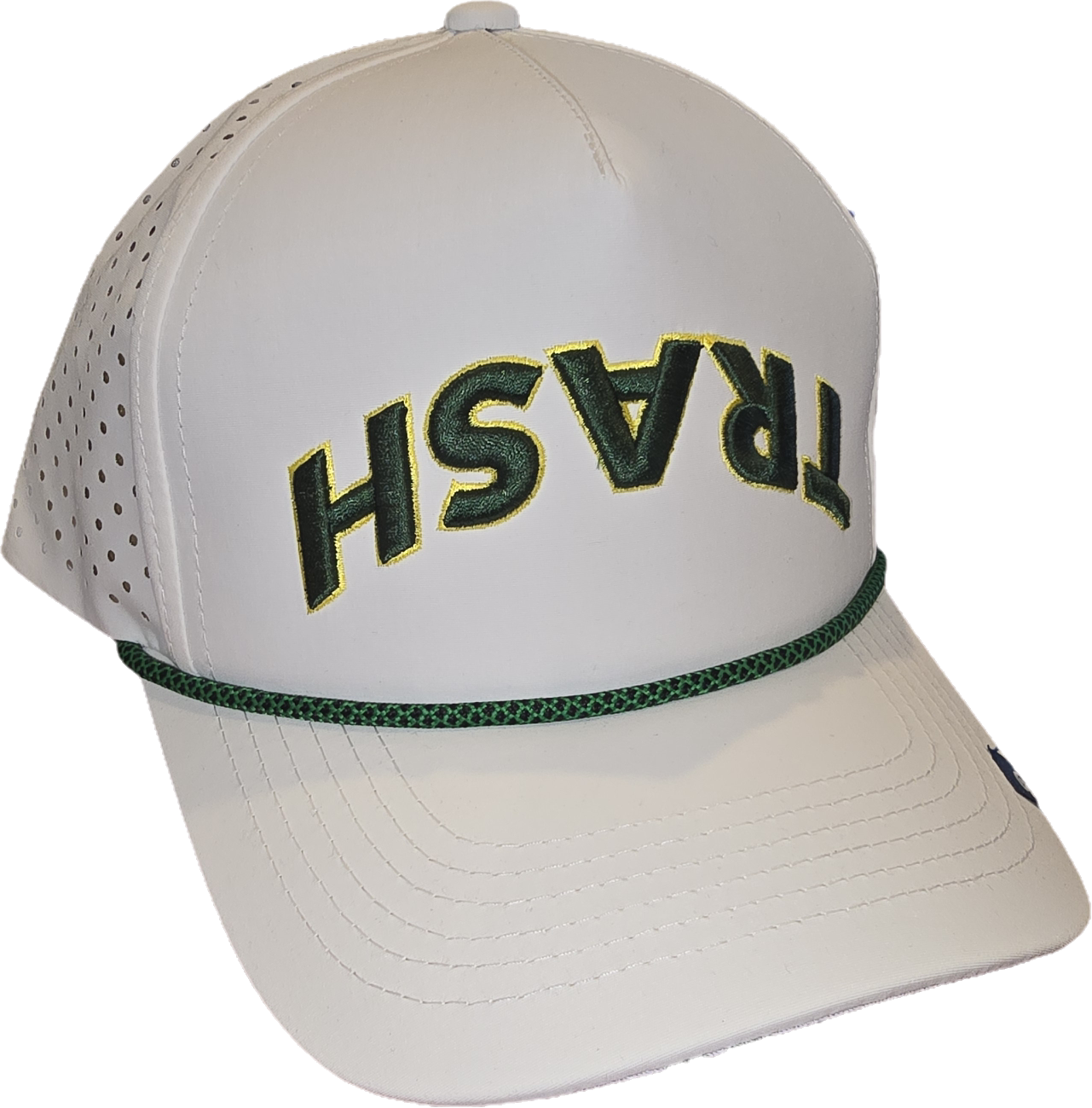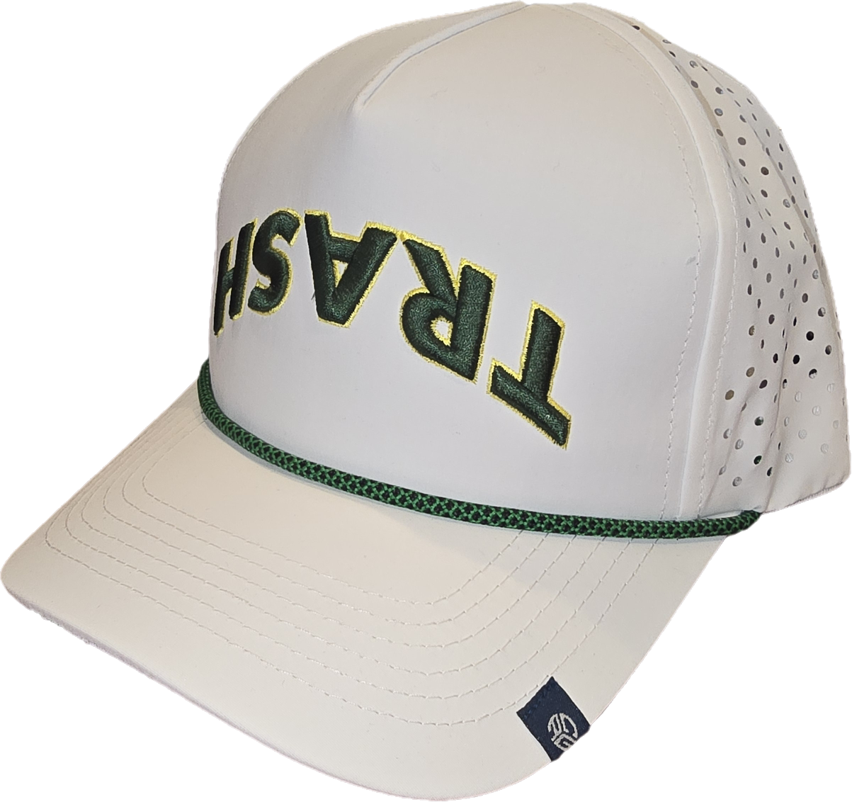 The TRASH Upside Down Rope Snapback is a playful twist on classic golf hats, designed for those who like their humor as bold as their drives. The embroidered "TRASH" design is flipped upside down for a not-so-subtle nod to the Waste Management Phoenix Open, where style and fun come to play. Crafted with perforated panels, a moisture-wicking sweatband, and retro rope detailing, this hat keeps you cool, comfortable, and laughing through every hole—no matter how many strokes it takes.